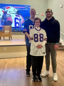 Ron Knox opened the event by introducing those who made it possible. They included his wife of 55 years, Kaye Knox, Heritage resident Tom Clark who suggested the idea of having Dawson visit, and The Heritage’s Director of Community Life, Ashlie Burnett. All wore blue or white Bills’ jerseys emblazoned with Dawson’s No. 88.
